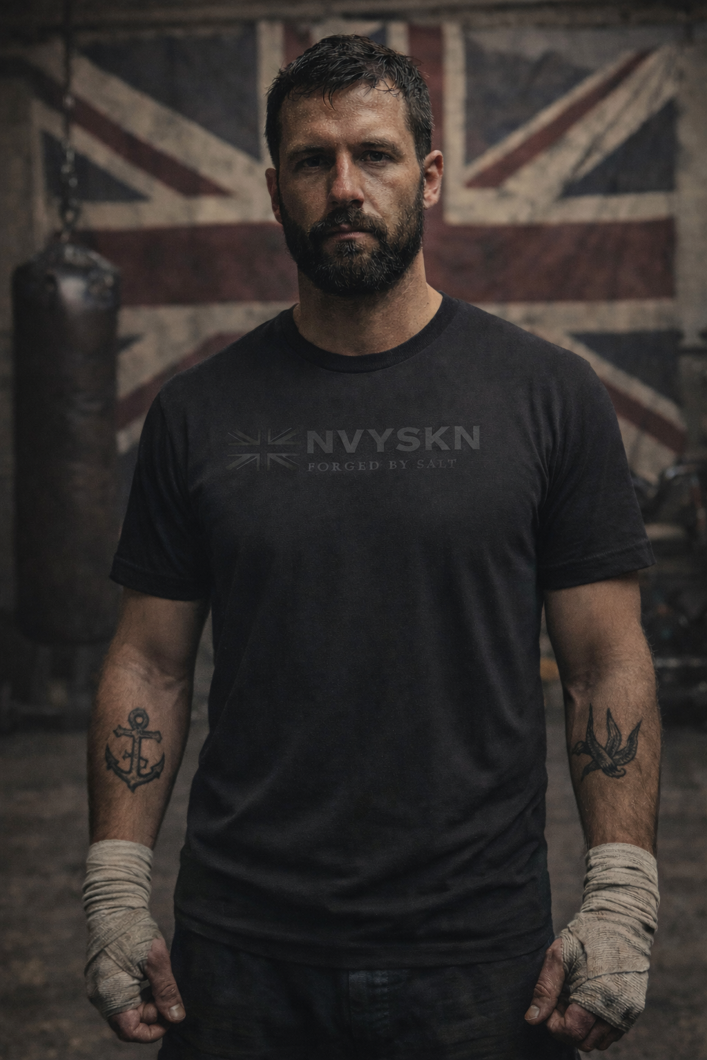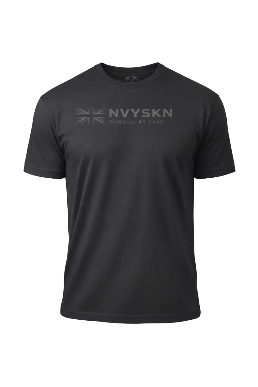 The Forged by Salt tee is stripped back and deliberate. Subtle chest branding combines NVYSKN typography with a faded Union Jack, referencing British maritime heritage without shouting for attention.
